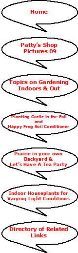 Come in and check out my Gardening & Organic products: Natural & Organic insecticides, fungicides, fertilizers, composters, wormtopias, gloves, books, container gardens, great garden gifts and much more! We have Beneificial Insects in season. Lady Bugs, Lacewings. We carry Red Wigglers for making your own "Black Gold" ******************************************************************* Plant Garlic in the Fall for Summer Harvest Fall is the perfect time to plant Garlic. There have been studies done that have shown garlic bulbs planted in the fall produce twice as much than bulbs in the spring. You need to plant garlic about 4-6 weeks before the ground freezes so it can set roots but not necessarily sends new shoots up. If you get a some growth before winter arrives no need to worry, your garlic plants will be perfectly fine. For more info on planting garlic e-mail patty@pattysplants.com ******************************************************************* "Feed The Soil & The Soil Will Feed your Plants" Plants are only as good as the soil you grow them in. By working in organic matter over a period of time, you will get great results. Every year will get better and better. Add leaves to your garden in the fall and let the worms take over. You can top dress with organic matter around your flower, herb beds and even around your trees and shrubs. Use Happy Frog soil conditioner to get your plants off to a good start and keep them healthy. It is hand-blended in small batches, Happy Frog Soil Conditioner contains forest humus, bat guano, and earthworm castings. For an added boost to plant development, it also contains beneficial microbes and humic acid, both of which strengthen roots while aiding nutrient absorption. You can work it in your soil and use it as a fine conditioning mulch. Comes in three cubic feet bales. Click to see the list of the Heirloom & Organically grown vegetable and herb plants that we carry at Patty's Plants. Organic Tomato ,Pepper ,Veggie varieties, Organic herb and flower lists. Patty's Plants 220 S. Janesville St. Milton WI (608)-580-0066 patty@pattysplants.com |